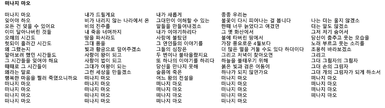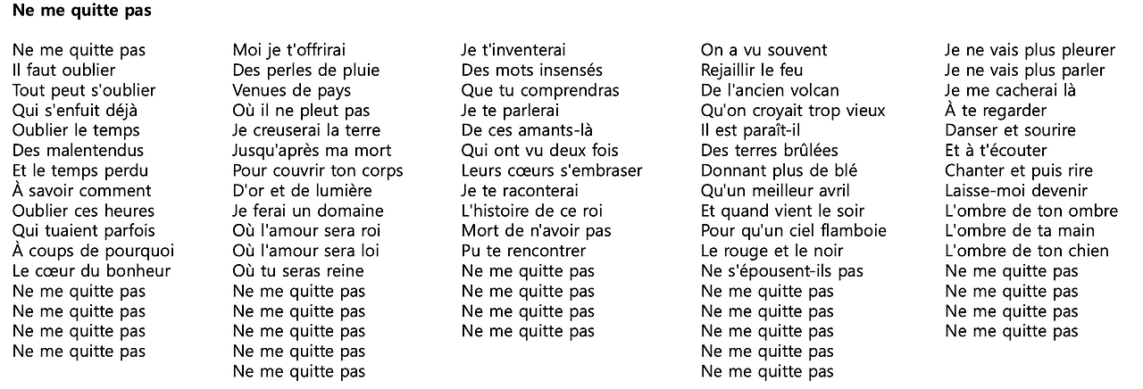 원곡의 프랑스어 가사는 참을 수 없을 정도로 강렬한 간청과 자기 비하적인 절박함으로 특징지어집니다. 화자는 연인에게 자신을 떠나지 말라고 거듭 애원하며, 비가 오지 않는 나라에서 "비의 진주"를 주거나, 그녀의 가슴을 "황금과 빛"으로 덮기 위해 "죽을 때까지 땅을 파겠다"는 불가능한 약속을 합니다. 심지어 그는 "당신의 그림자의 그림자, 당신 손의 그림자, 당신 개의 그림자"가 되겠다고 제안하기까지 합니다. 이러한 반복되는 후렴구와 생생한 이미지는 버려짐에 대한 심오하고 모든 것을 집어삼키는 두려움을 강조하며, 절박한 무조건적 사랑의 보편적인 찬가가 됩니다.