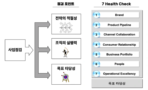 전략 및 실행력의 체계적이고 구조적인(MECE) 점검을 위해 7-Health Check 항목을 기반으로 한다.