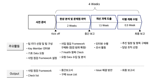 점검 계획 수립 일정을 제외한 실제 사업 점검 일정은 최대 4주를 넘기지 않는 것이 좋다. 점검 계획은 최고경영자 및 해당 사업 부문의 리더가 포함된 회의체에서 보고하고, 최고경영자의 위임을 획득하여 수행하여야 한다.