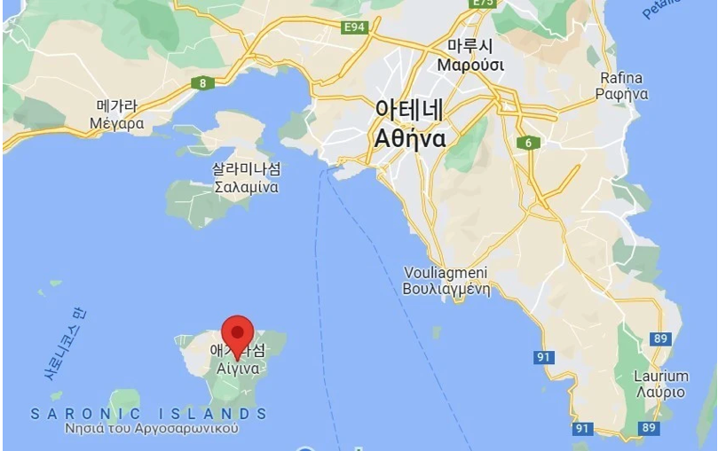 [참고] 아이기나(Aigina, 에기나)는 그리스 사로니코스만(Saronic Gulf)에 위치한 섬으로, 아테네에서 약 27km 떨어져 있다. 고대에는 강력한 해상 교역의 중심지이자, 아테네와 해상 패권을 놓고 경쟁하던 독립 폴리스로 번성했으며, 특히 기원전 6세기에서 5세기 사이에 절정기를 맞았다.