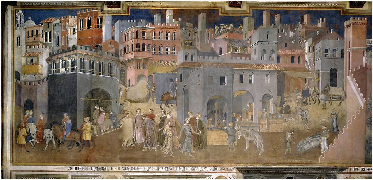 이런 덕목 기반의 역할 분담이 만들어내는 조화로운 사회의 모습은 14세기 화가 암부로조 로렌체티의 프레스코화 〈선한 정부와 나쁜 정부의 알레고리〉 속에서 생생하게 표현된다. 그림 속 통치자, 시민, 교사, 상인, 장인 모두가 각자의 역할에 충실하며 활기찬 도시를 만들어간다. 이것이 바로 플라톤이 그렸던 정의로운 공동체의 모습이다.