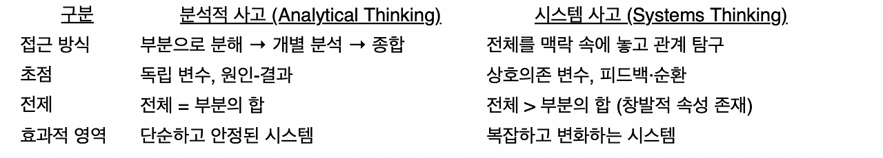 분석적 사고는 단순하고 독립적인 시스템에서는 유용하지만, 현실 세계의 상호의존적 복잡성을 설명하기에는 불충분하다.