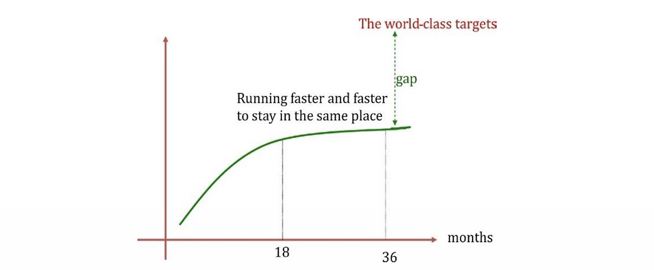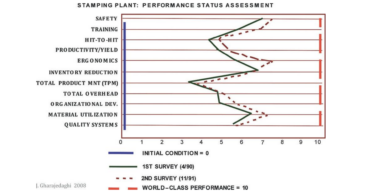 우드헤이븐 공장은 11개 개선 항목을 정하고, 각 항목을 0(초기 상태)에서 10(세계 수준)까지 3년 안에 끌어올리려 했다. 초기에는 성과가 있었지만, 18개월 만에 개선이 정체되었다. 이후 아무리 노력해도 더 나아지지 않았다.