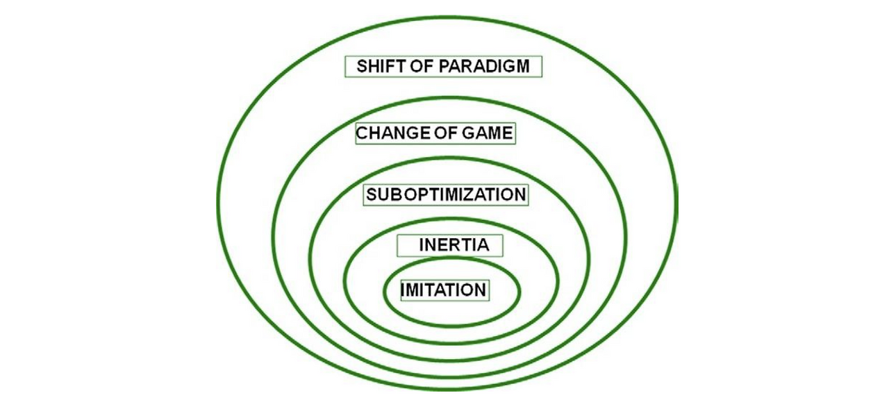 지금까지 살펴본 다섯 가지 요소—모방, 타성, 부분 최적화, 게임의 변화, 패러다임 전환—은 각각 독립적인 현상이 아니라, 서로 연결되어 점진적으로 심화되는 계층 구조를 이룬다.