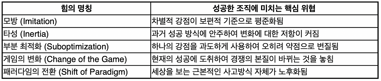 이 다섯 가지 요소가 성공한 조직에 가하는 위협을 요약하면 다음과 같습니다.