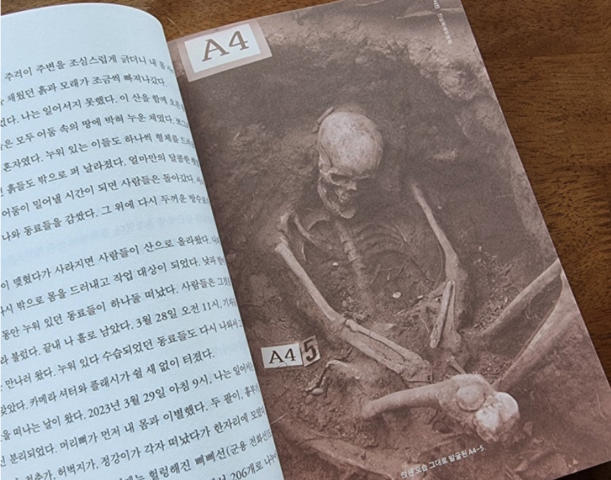 그가 밝힌 집필의 동기는 호기심에서 비롯되었단다. 2023년, 조간신문에서 아산시 배방읍에서 발견된 한 장의 유해 사진, 즉 '얼굴 없는 얼굴'(A4-5)를 보면서부터였다. 73년 전 파묻혔음에도 쪼그리고 고개를 처박은 자세로 온몸의 뼈들이 원상태로 연결된 충격적인 모습을 본 것이었다. 이 유해가 한국전쟁기에 재판 없이 처형된 민간인 희생자임을 알았을 때, 저자는 즉각적인 충격보다는 "어떻게 저럴 수 있지?", "저 사람 누구지?"라는 질문과 궁금증에 사로잡혔다고 한다. 그것이 글을 쓰게 된 결정적인 동력이 되었다는 얘기. 이 궁금증을 해결하기 위해 현장에서 발굴 실무 책임자인 체질인류학자 '선주'를 만나면서 이야기는 본격적으로 전개된다.