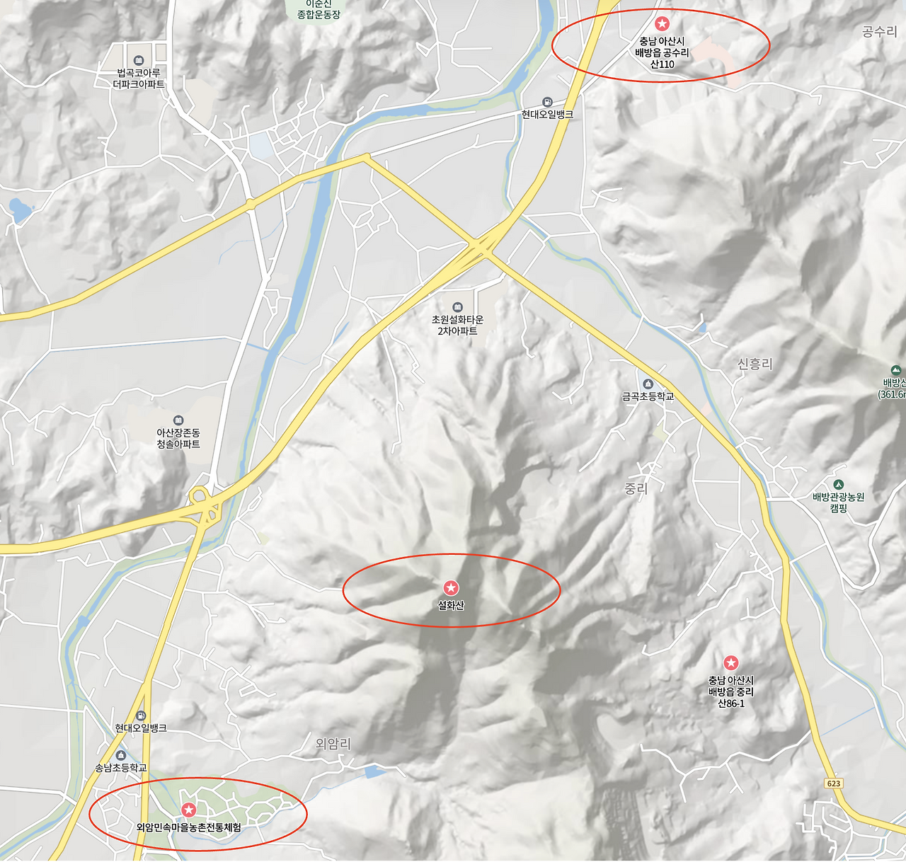그곳은 남서쪽으로 설화산을 두고 있는 산 아래 금곡천에 가까운 산기슭이다.