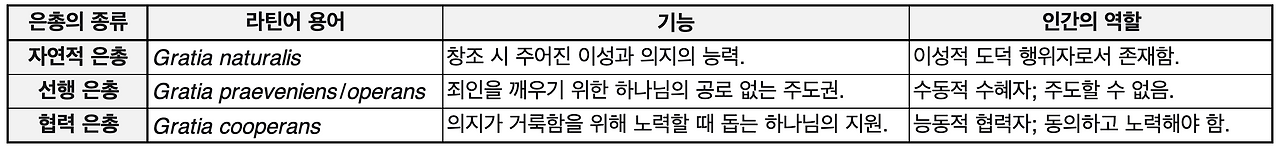 3) 협력 은총 또는 완성하는 은총(Gratia Cooperans): 일단 선행 은총에 의해 의지가 깨어나면, 구원 사역을 완성하기 위해 의지가 동의하고 협력해야 한다.
