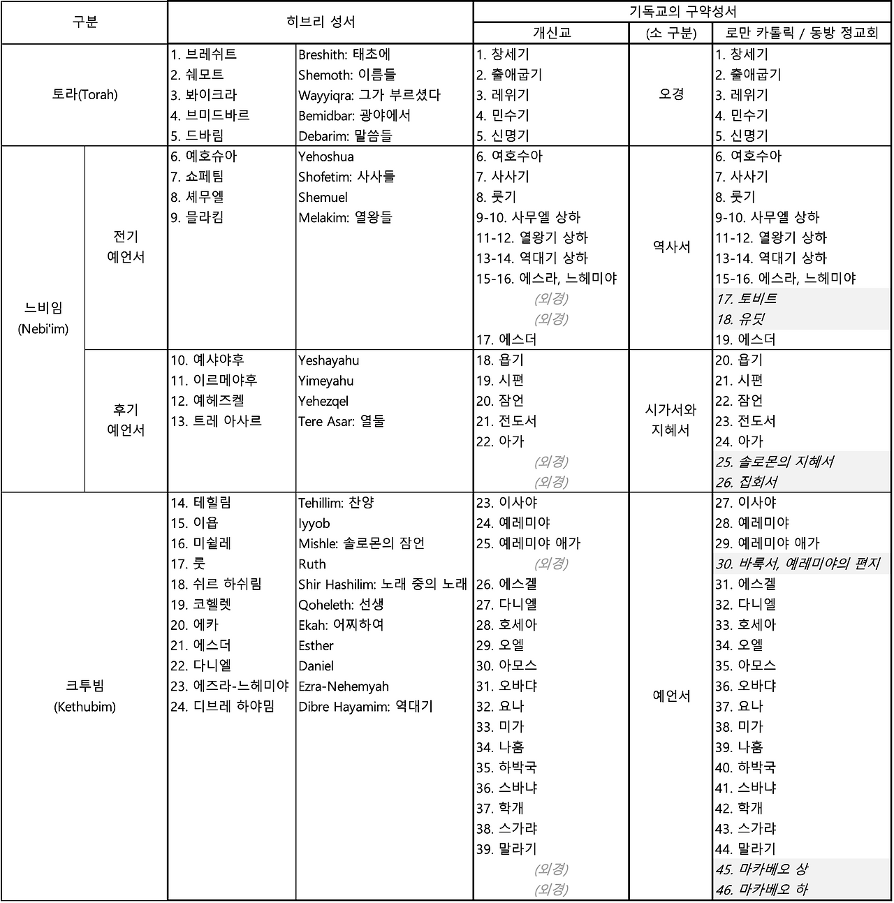 유대교의 경전인 히브리 성서는 총 24권으로 구성되어 있으며, 기독교의 구약성서는 기원전 3세기에 이집트의 알렉산드리아에서 그리스어로 번역되기 시작한 칠십인역(the Septuagint)을 기준으로 구분된다. 즉 개신교에서는 히브리 성서에는 포함되어 있지 않지만 칠십인역에 추가되었던 책들을 '외경(Apocrypha: 숨겨진 또는 비밀의 문서들)'의 지위로 강등하여 별도로 구분하였다. 외경은 읽을 만한 가치가 있는 책들이지만, 성서의 다른 책들과 동등한 가치를 지니지는 않는다고 본 것이다. 따라서 구약성서는 총 39권에게 공식적인 정경의 지위를 부여하였다. 가톨릭과 정교회는 이와 달리 70인역에 포함된 7권의 책을 모두 받아들여 총 46권을 정경으로 인정하고 있다. 4) (동방정교회에서는 30번에 속해있는 '예레미야의 편지'는 포함(인정)하지 않는다.)
