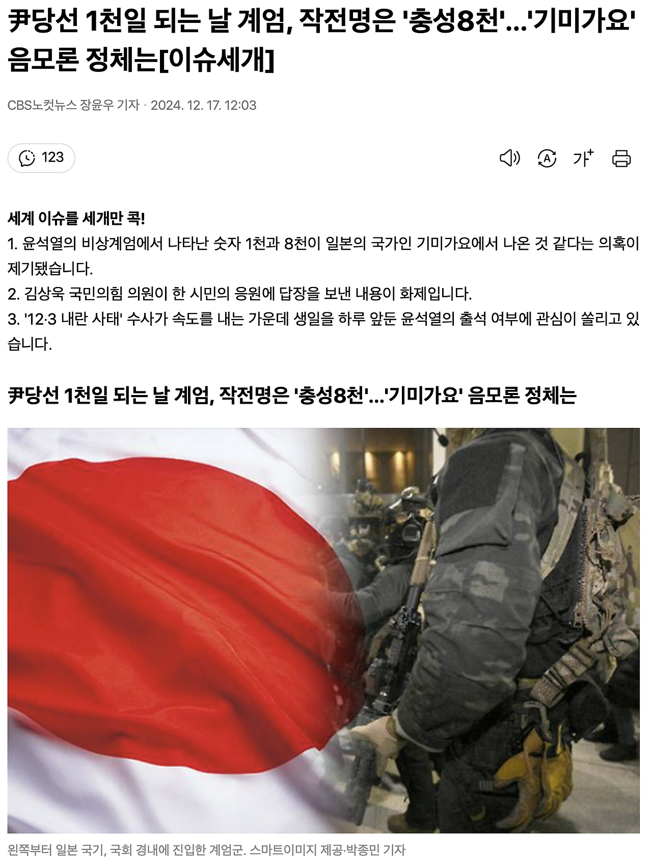 잘못하면 "음모론" 경지에 가까워지는 이야기를 경계해야 하지만, "당선 1천 일 되는 날 계엄"이란 정말 우연일까, 싶을 정도입니다. 김-윤 부부 사기단의 경우 일단 "무속"에 엄청 민감하다는 점을 기억해야 합니다. "수"는 역술 등 각종 민속종교/신종교/점술에 상당한 의미를 차지합니다. 그래서 "수"를 얼마든지 맞추었을 수도 있단 생각은 들긴 합니다. 기미가요(君が代) 관련 부분은 몰라도요.