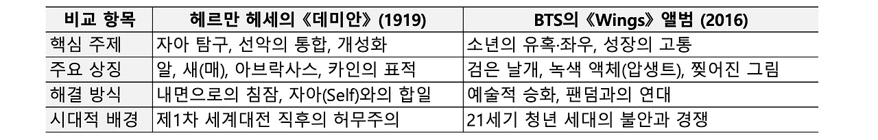 BTS는 단순한 인용을 넘어, 『데미안』의 핵심 사상을 K-pop의 언어로 재구성했습니다. 고전을 장식물이 아니라 서사 구조의 뼈대로 전환한 작업이었습니다.
