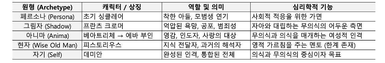 『데미안』은 말 그대로 융 심리학의 문학적 주석이라 할 만큼, 분석심리학의 핵심 원형들이 정교하게 구조화된 작품이라는 평입니다. 싱클레어의 성장 서사는 무의식을 의식화하며 참된 자아로 나아가는 개성화 과정의 전형적 구조를 그대로 보여준다는 겁니다.