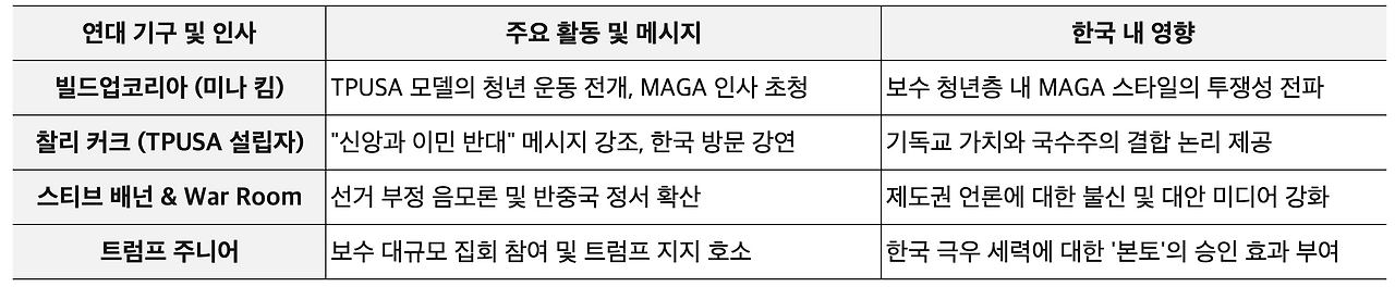 오히려 미국의 MAGA 진영과의 직접적인 교류와 네트워크를 통해, 그들이 사용하는 정치 전략과 수사 방식(레토릭)이 거의 실시간에 가깝게 한국 사회로 유입되고 있는 현상을 확인할 수 있습니다.