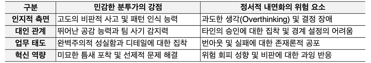 한편으로 이들은 뛰어난 통찰력과 높은 공감 능력을 바탕으로 혁신을 촉진하고 팀의 결속을 강화하는 데 기여합니다. 그러나 다른 한편으로는 작은 비판이나 모호한 피드백에도 과도하게 반응하여 심리적 타격을 받기 쉽고, 그 결과 자기 의심이나 가면 증후군Impostor Syndrome에 빠질 위험 또한 높습니다.