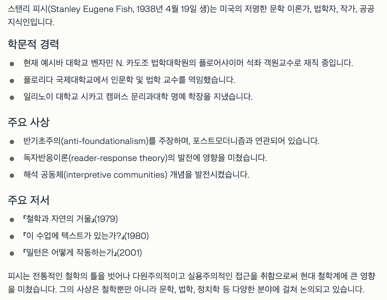 피시는 텍스트가 외부에서 독자를 변화시킬 수 없으며, 의미의 기준은 사회적 전제와 연관된다고 강조한다.