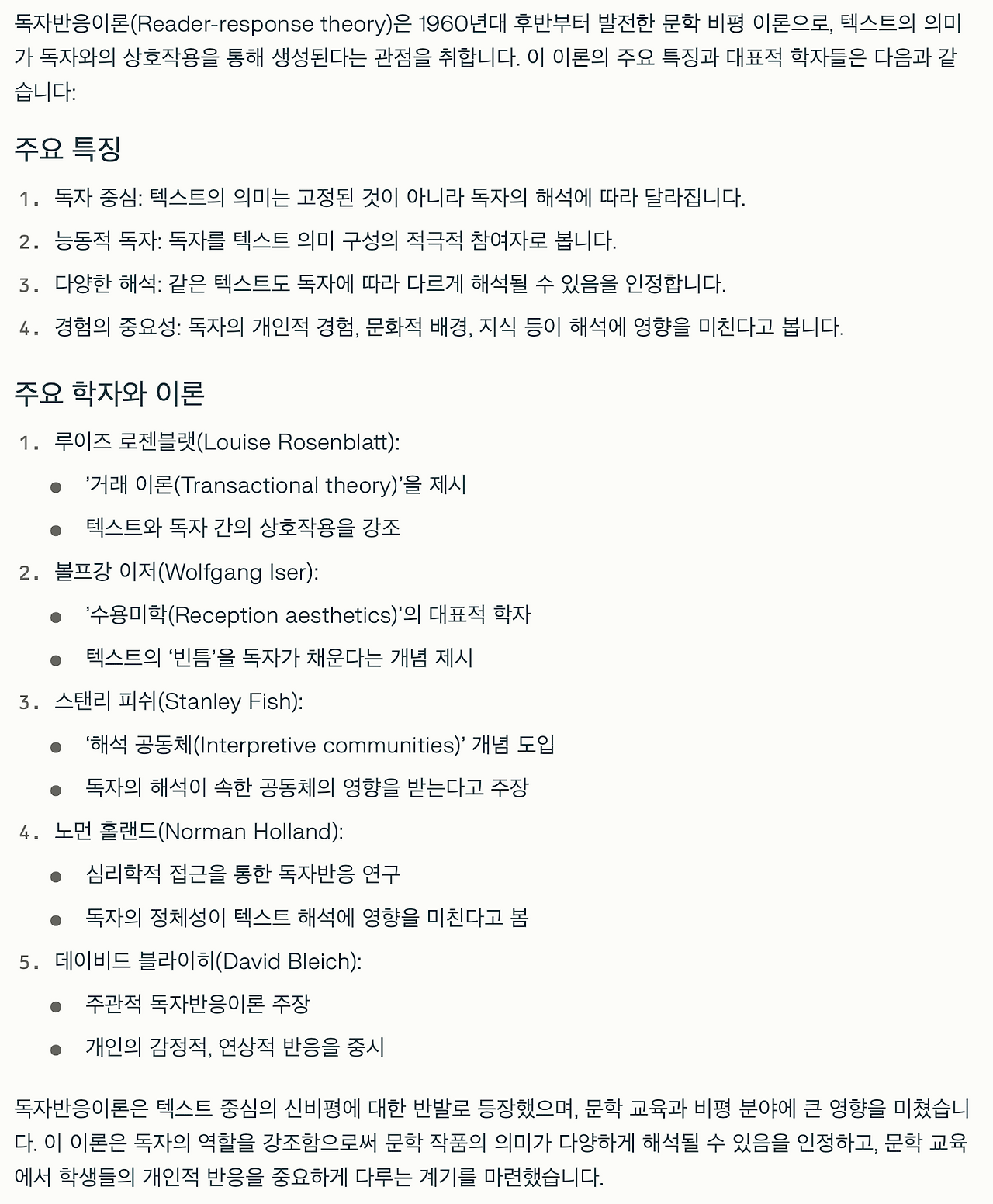 독자의 반응이 곧 의미 그 자체라는 주장과 모든 것이 환경에 달려 있다는 입장이 강조된다.