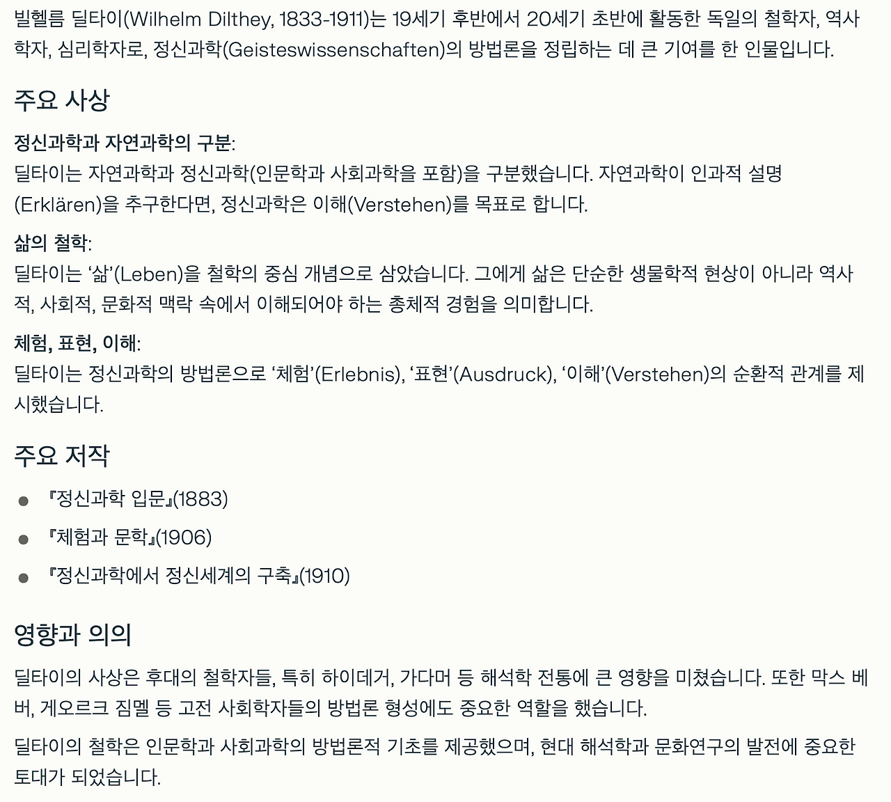 딜타이는 '경험'과 '삶'을 중시하며, 인간 행동의 주관성을 객관적으로 이해할 수 있는지에 대한 질문을 던졌다.
