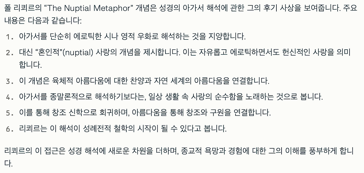 리쾨르의 대표적인 예시는 'The Nuptial Metaphor' 에세이에서 등장하며, 이는 특히 솔로몬의 노래를 다룬다.