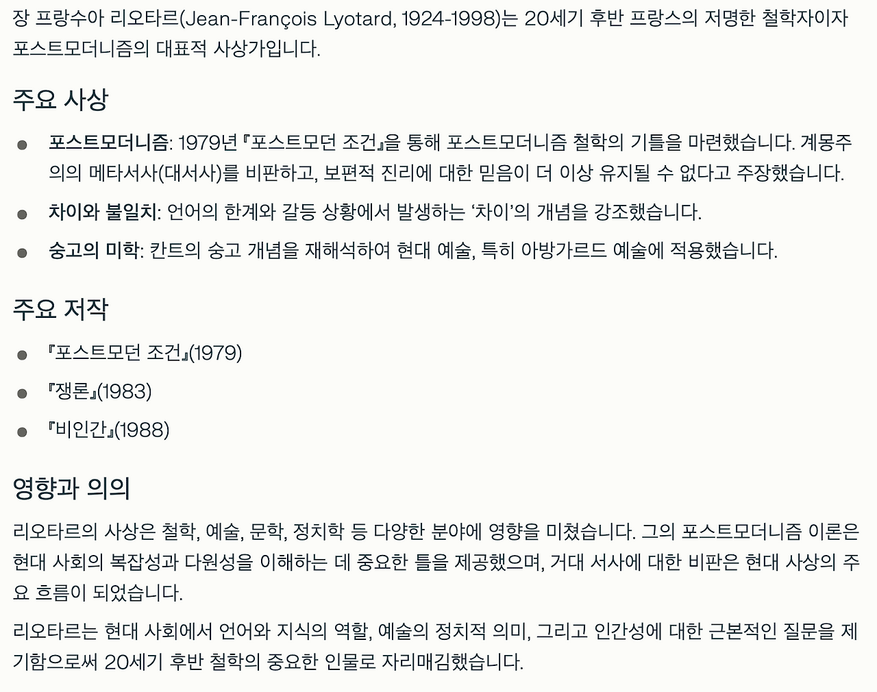 리오타르의 사상은 여러 이론을 아우르는 '그랜드 내러티브'에 대한 불신을 표현하고 있으며, 정치적 구조를 '테러'로 여겨 거부한다.