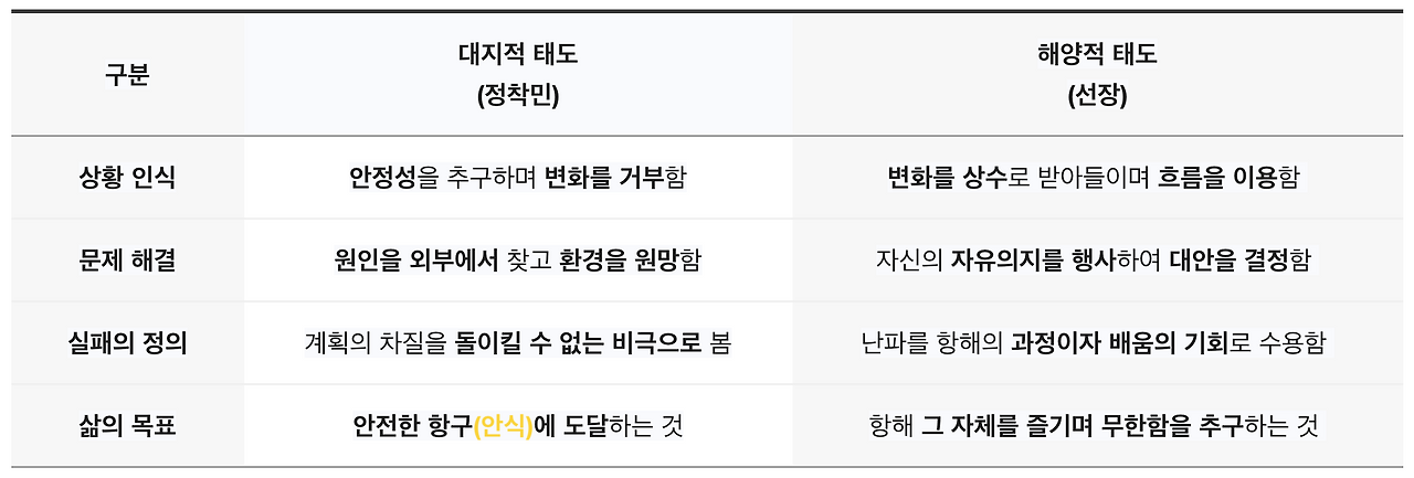 이러한 관점은 삶을 우리가 정복해야 할 '산'으로 여기던 기존의 강박에서 벗어나, 삶을 그저 '살아지는 것'으로 수용하되 그 안에서 주체적인 선장이 되는 법을 가르친다고 할 것입니다.