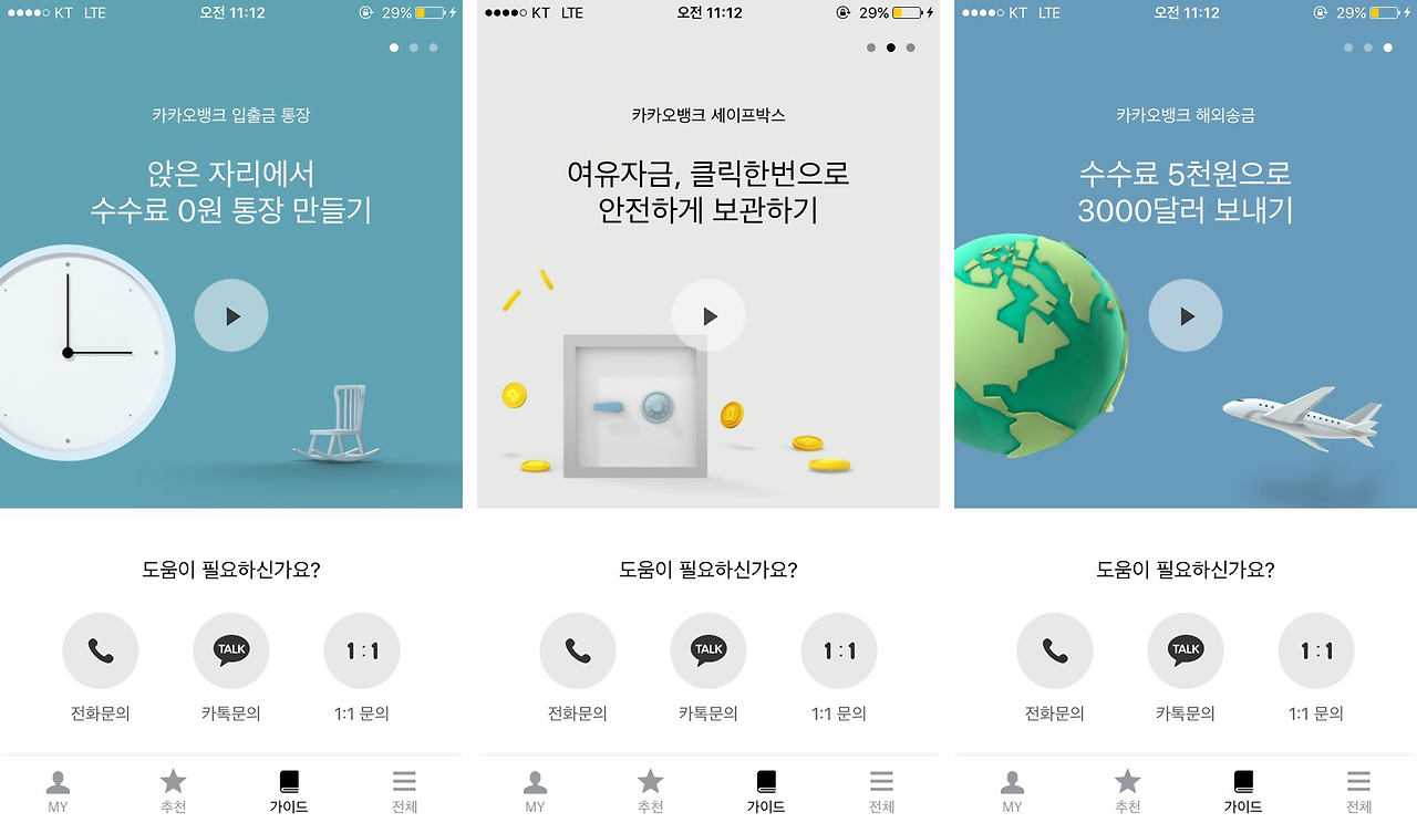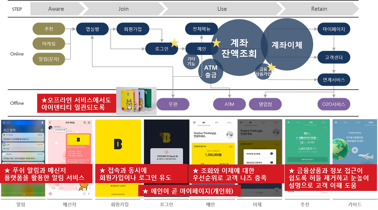 즉 UX를 디자인(설계)하는 데 있어서 적재적소에 UI를 노출시켜야 하는 것이지, UI를 나열해 놓고 User가 알아서 Experience를 하라는 식의 서비스는 고객을 혼동을 야기한다는 것이다. 그리고 기존의 금융 서비스 대비 카카오뱅크 서비스의 장점은 고객이 가장 먼저 해야 할 행위에 대한 집중과 명확한 NEXT 유도로 사용자 혼동을 최소화했는 것이다.