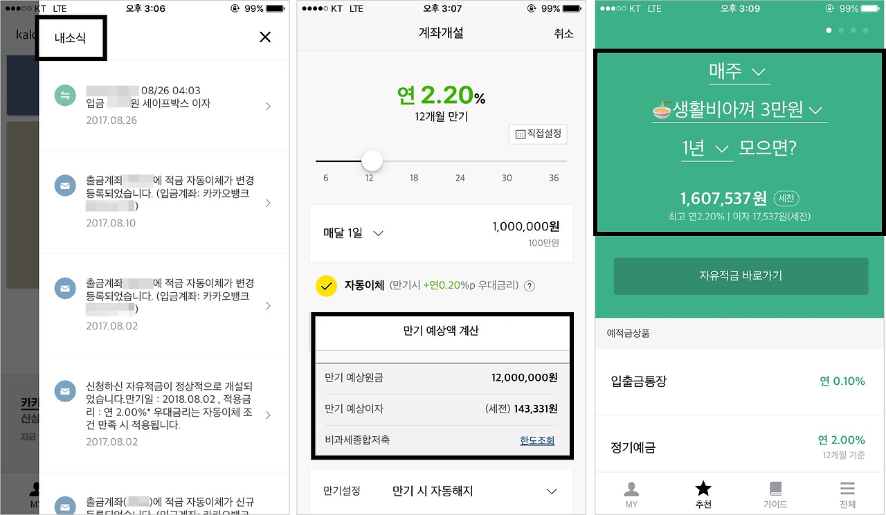 일반적으로 최소 금리와 우대금리를 합산하여 만기 예상액을 예측해야 되는 시중은행의 서비스와 달리, 카카오뱅크는 자동이체 신청 시 만기 예상금액을 노출