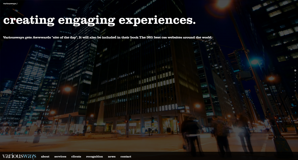 플랫디자인의 유행으로 서로 다른 사이트가 유사한 디자인을 가짐에 따라 개별 서비스는 각자의 개성을 드러내기 위해 다양한 시도를 하고 있습니다. Full Screen Image와 Video를 활용하거나, 오토플레이 사운드를 적용할 경우 방문자에게 강한 인상을 남길 수 있습니다. 특히 서비스의 스토리를 반영한 일러스트레이션이나 애니메이션이 적극적으로 활용되는 추세입니다. 이처럼 이미지와 비디오를 전면에 내세우는 사이트가 많아지면서, 단색 배경 위에 텍스트와 라인을 이용해 구성한 사이트가 오히려 독특한 인상을 남기기도 합니다.