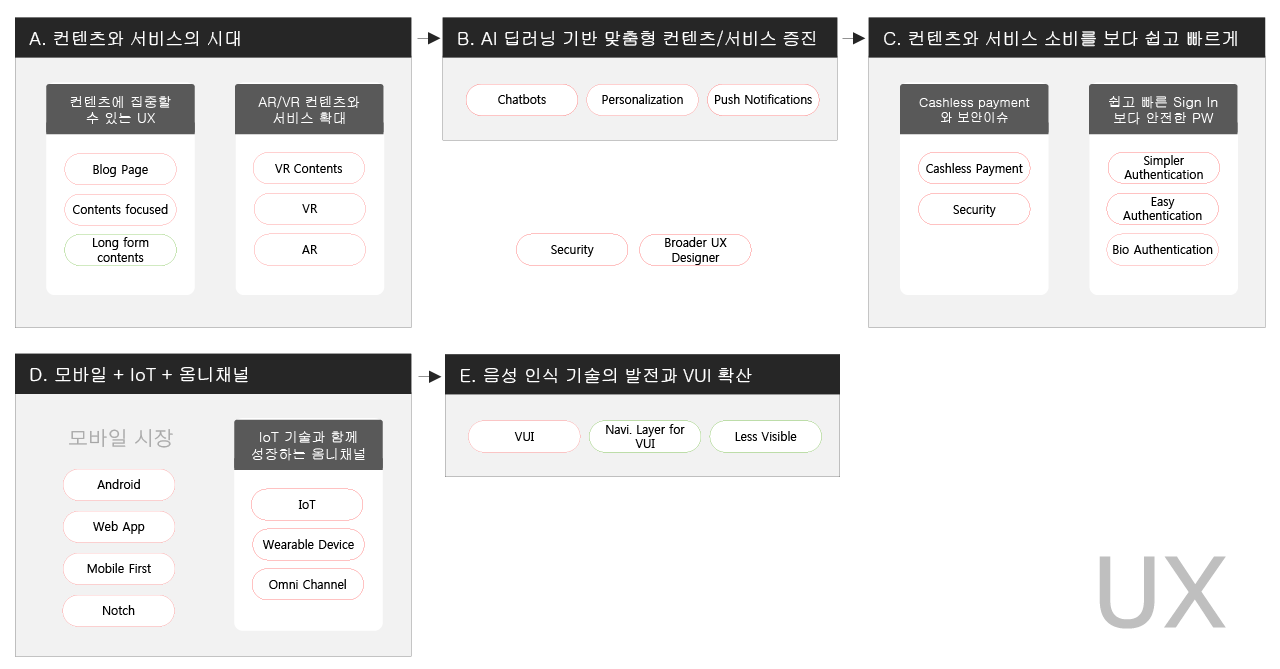유플리트 SDLab은 2018년 UX/UI 디자인 트렌드를 살펴보고자 국내외 UX/UI 트렌드 리포트를 분석하여 주요 키워드를 도출하였습니다. 도출된 키워드를 바탕으로 주요 트렌드를 UX, UI 측면으로 나누어 정리하였습니다.