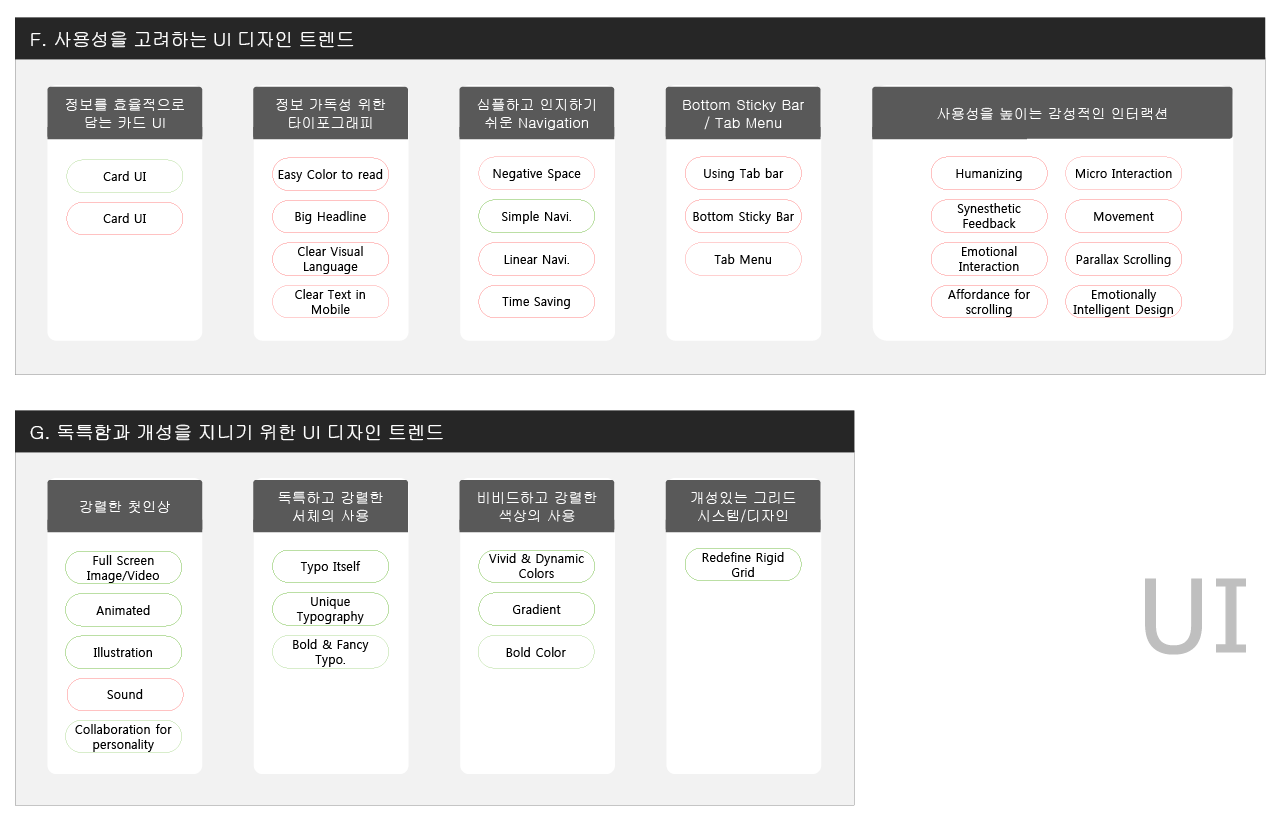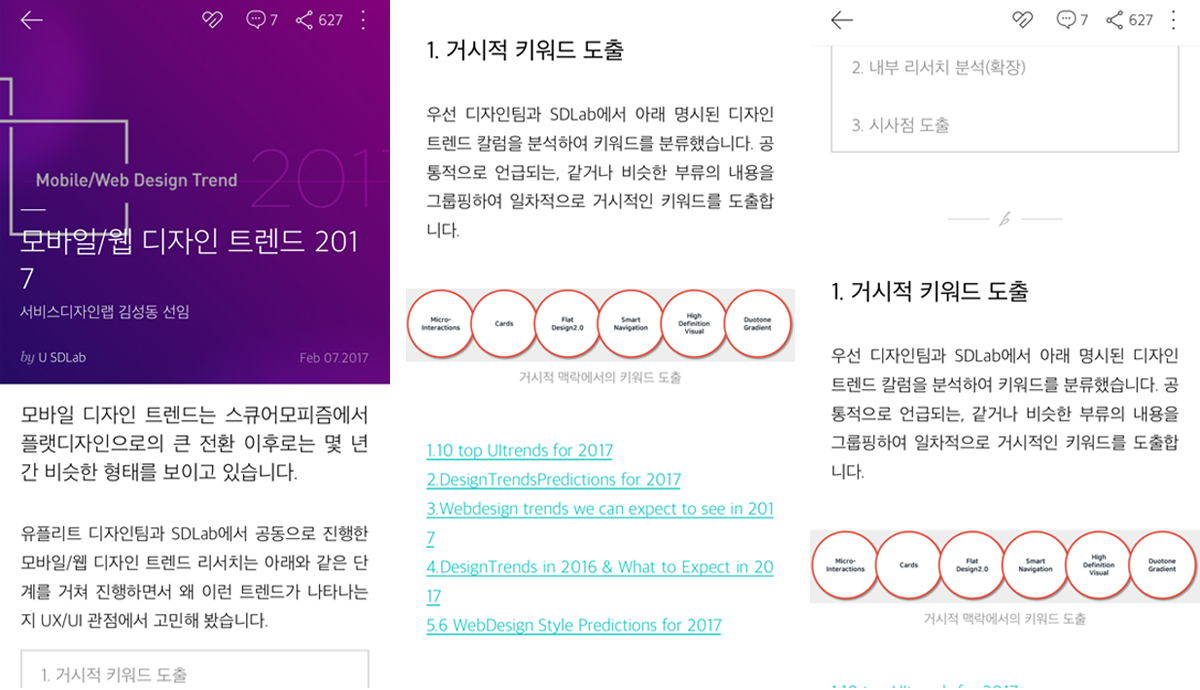 플랫디자인의 심플함을 넘어 각자의 개성과 차별성을 드러내기 위해 탈그리드, 셰리프 서체와 같은 키워드들이 매년 새로운 디자인 트렌드로 거론되어 왔습니다. 하지만, 플랫 디자인과 구글 머테리얼 디자인은 사용성과 보편성을 바탕으로 수년간 UX/UI 디자인을 주도하고 있습니다. 이러한 흐름이 크게 뒤바뀌지는 않을 것으로 보이지만, 콘텐츠와 서비스가 다양해짐에 따라 개성을 드러내고 사용자의 주목을 끌기 위한 시도들이 계속될 것으로 보입니다.