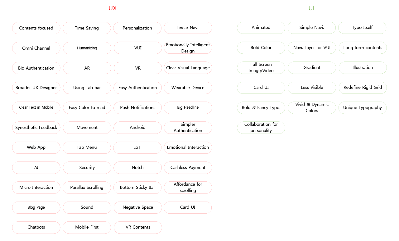 단순히 키워드를 비교할 때 2018년 UX/UI 디자인 트렌드는 Minimalism, Personalization, Flat 2.0 과 같은 그동안의 흐름을 크게 벗어나지 않는것 같습니다. 하지만 VR/AR, VUI 등의 새로운 기술들이 점차 우리 삶에 일부로 성장하면서 새로운 고민 거리와 트렌드가 성행할 것으로 예상됩니다.