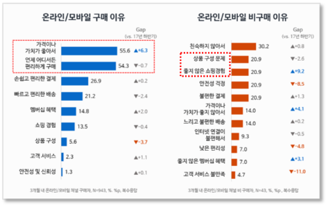 Opensurvey에서 조사한 2018년 상반기 모바일 쇼핑 트렌드 리포트에 따르면 온라인/모바일 구매 이유는 가격이나 가치가 좋아서(55.6%), 언제 어디서든 편리하게 구매해서(54.3%)가 가장 많았으며, 온라인/모바일 비구매 이유는 친숙하지 않아서(30.2%), 상품 구성 문제(20.9%), 좋지 않은 쇼핑 경험(20.9%)이 가장 많았습니다.