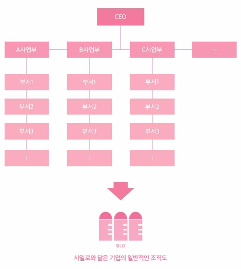 좋은 서비스를 만들기 위해 가장 먼저 고민해 봐야 할 것은 기업들이 제공하는 서비스 방식이다. 현재 우리나라 기업의 조직은 대부분 사일로(Silos) 형태를 이루고 있다. 사일로는 큰 탑 모양의 곡식이나 사료를 저장해두는 창고로 굴뚝 모양의 원형창고를 일컫는 말이다. 이런 모양처럼 다른 부서와 서로 담을 쌓고 협력하고 소통하기보다는 각자가 속한 부서의 이익을 추구하는 모습에서 사일로 효과라고 불리는 경제 용어다.