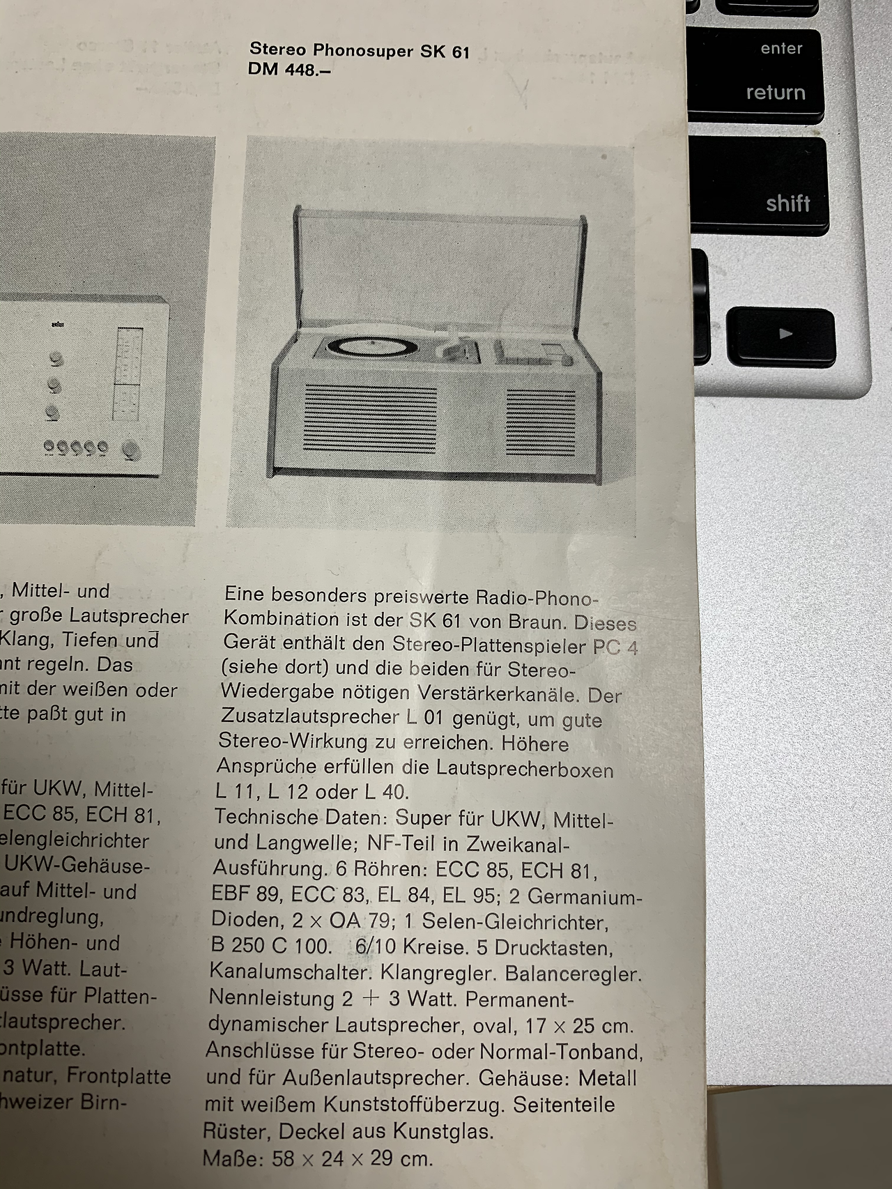 전시 관람 이후 나는 미친 듯이 디터 람스의 산업디자인 제품들을 검색해 봤다. 그러다 이베이까지 흘러들어 갔고 2019년 12월에서 2020년 1월 내내 이베이만 검색했다. 그러다 꽤 괜찮은 상태의 진공관 오디오인 SK 61 모델을 발견했다. SK 61은 58년부터 생산되기 시작한 SK 시리즈의 하나로 비교적 후기 제품이다. 후기라 봐야 62년도 생산품이긴 하다만. 투명한 아크릴 재질의 상부 커버 덕분에 '백설공주의 관'이라는 별칭을 얻었다고 한다.