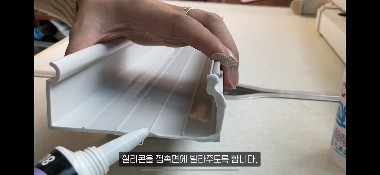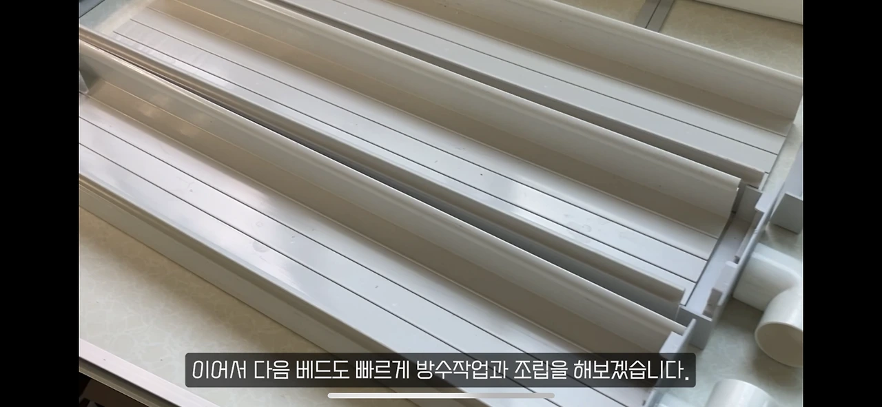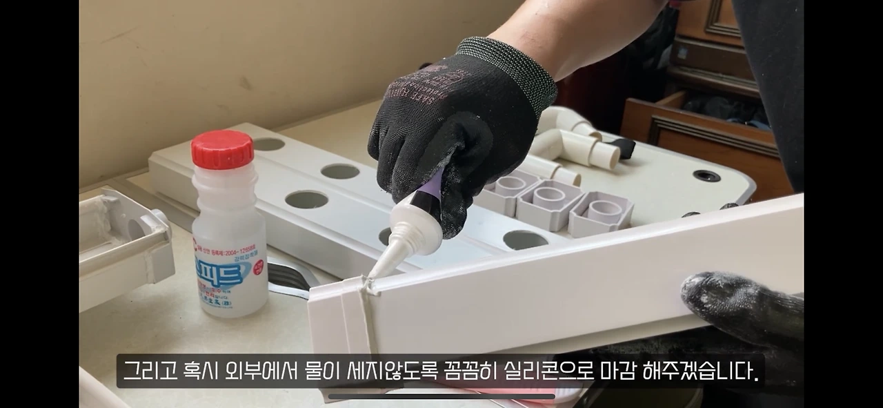 수경베드를 추가작업을 진행하면서 본드로 방수작업이 불가능하다 판단하여 실리콘으로 마감작업을 진행 중입니다