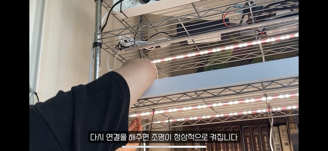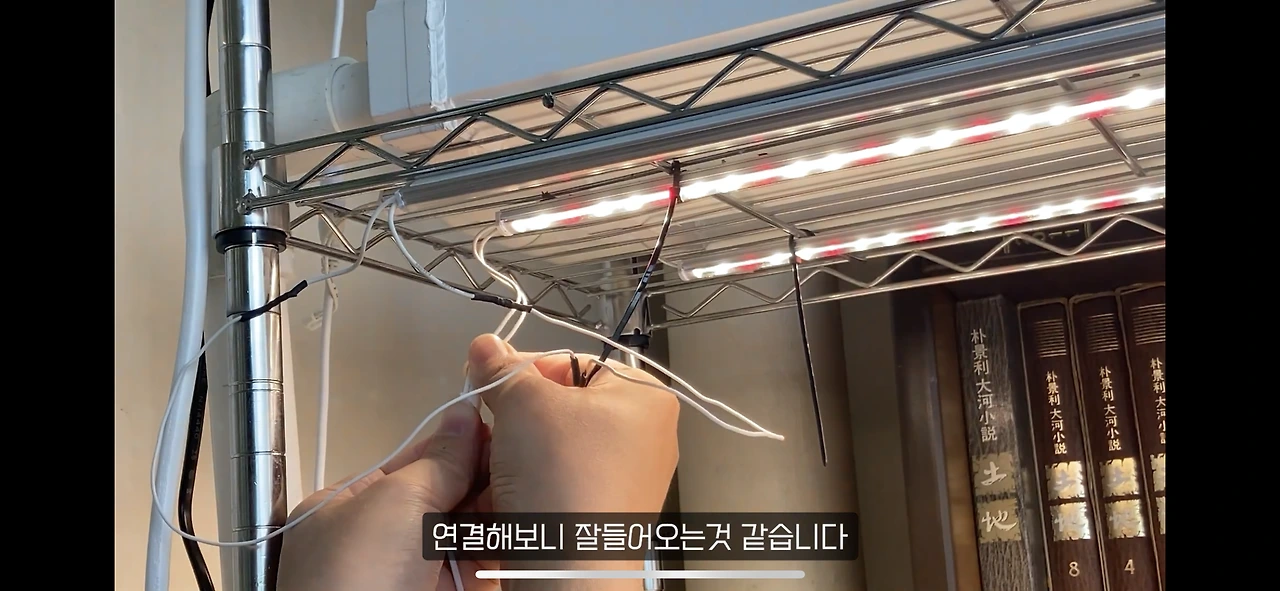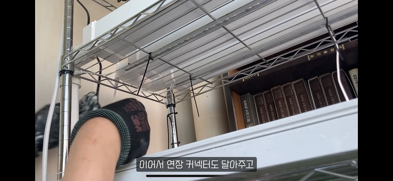 LED를 선반상판 부분에 케이블 타이로 장착을 해주고