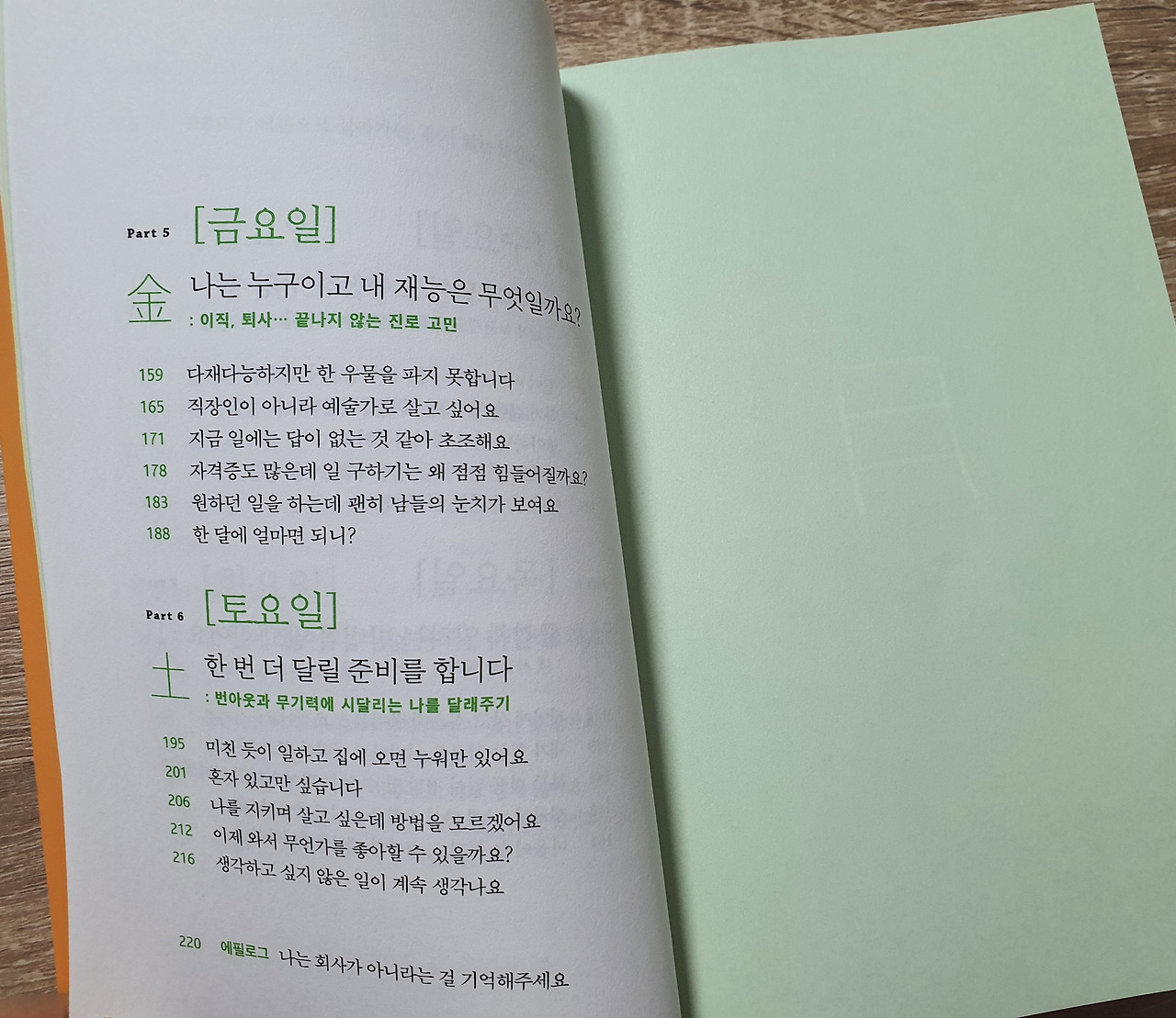 "작가가 심리상담가래. 대리 상담한다 생각하고 읽어봐. 나 같은 프로 퇴사러 얘기야 다 거기서 거기지. 중요한 건 퇴사한다고 문제가 다 해결되진 않는다는 거야."