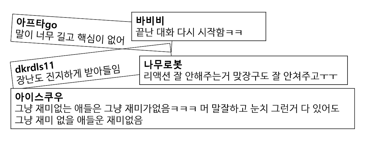 인터넷에 노잼인 사람들의 특징을 쳐보면 '진지함, 말이 너무 길다, 유행을 모름, 혼자만 재밌음, 자기 할 말만 함, 반대로 또 자기 얘기 안 함, 끝난 대화 다시 시작함, 리액션 없음' 등등.. 여러 특징들이 있다. 이런저런 특징들을 내가 나름대로 정리해서 내린 노잼을 좌우(decide)하는 최상위 카테고리는 "소통"이다.