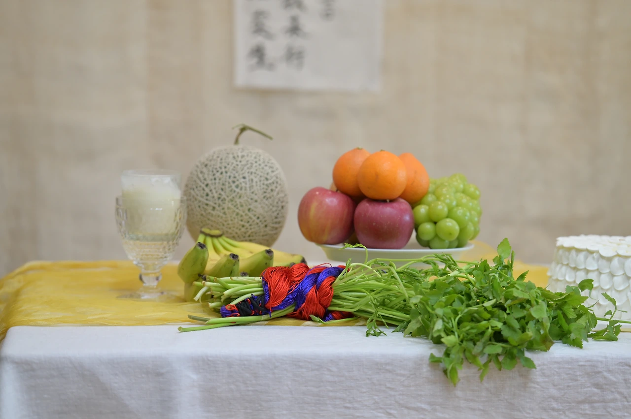 식탁보는 커튼, 테이블 러너는 목도리, 촛대는 크리스털 와인잔, 그릇은 국그릇 뒤집어 놓고 그 위에 접시를 얹었다. 꽃은 동네 꽃집에서 꽃만 사 와서 도자기 그릇에 대충 꽂았다. 강한 생명력을 뜻하는 미나리는 결혼식 때 썼던 청실홍실로 묶었다. 과일은 현대백화점까지 가서 저탄소 친환경으로만 샀다. 작은 형님이 사주신 케이크와 돌잡이까지 놔두니 식탁이 꽉 찼다.
