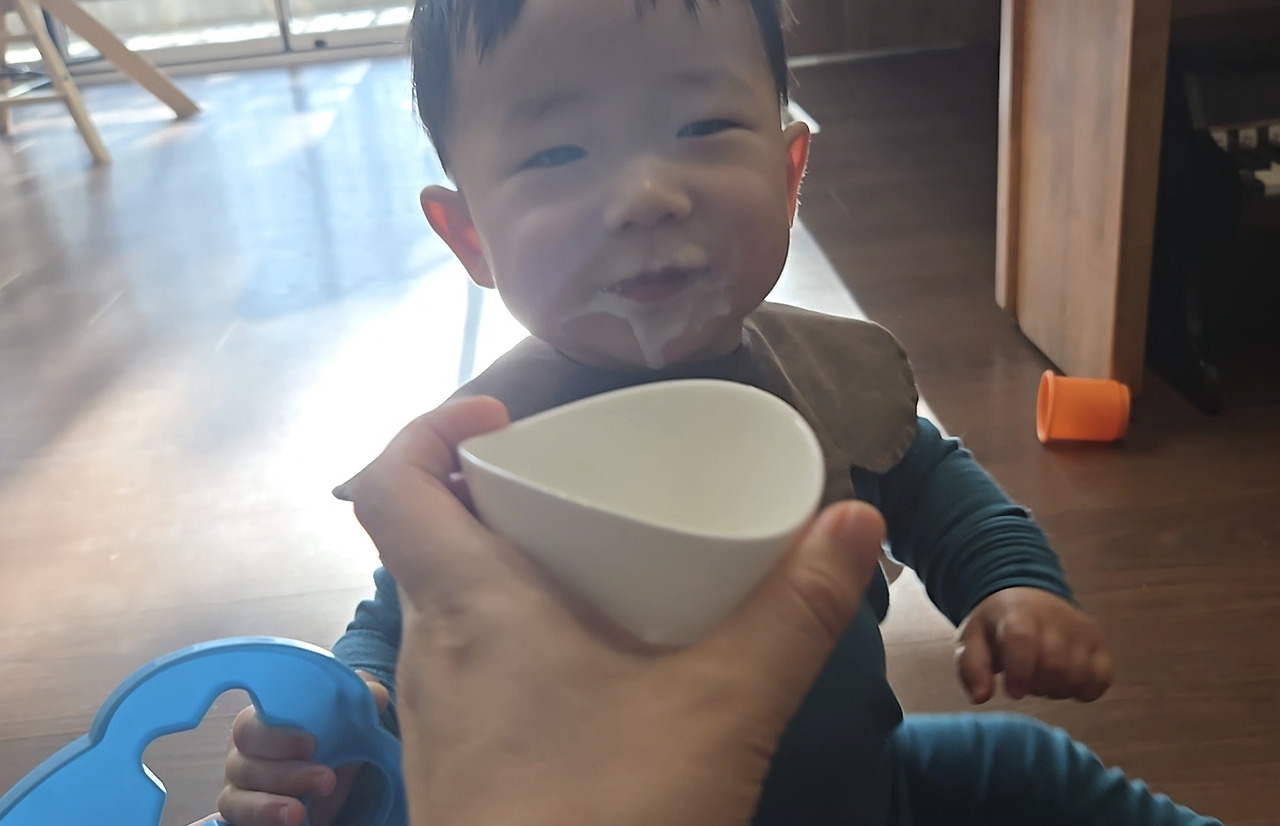 오늘 처음으로 우유를 먹여 봤다. 킨더밀쉬라는 아기들 먹는 우유가 있지만, 나는 그냥 마트에서 산 서울우유로 먹였다. 영양적으로 차이 없고 다만 킨더밀쉬가 달아서 아기가 더 잘 먹는다고 한다. 일반우유로 실패하면 킨더밀쉬로 넘어갈 생각이었다. 젖병이 아닌 컵을 사용했다. 분유를 줄이고 우유를 늘리면서 천천히 젖병을 졸업할 생각이다. 처음에는 손으로 밀치더니 숟가락을 몇 모금 맛보고 나선 30ml 후딱 먹었다. 거의 흘리지도 않았고 잘 받아먹었다. 다행이다. 계속 이렇게만 해주길.