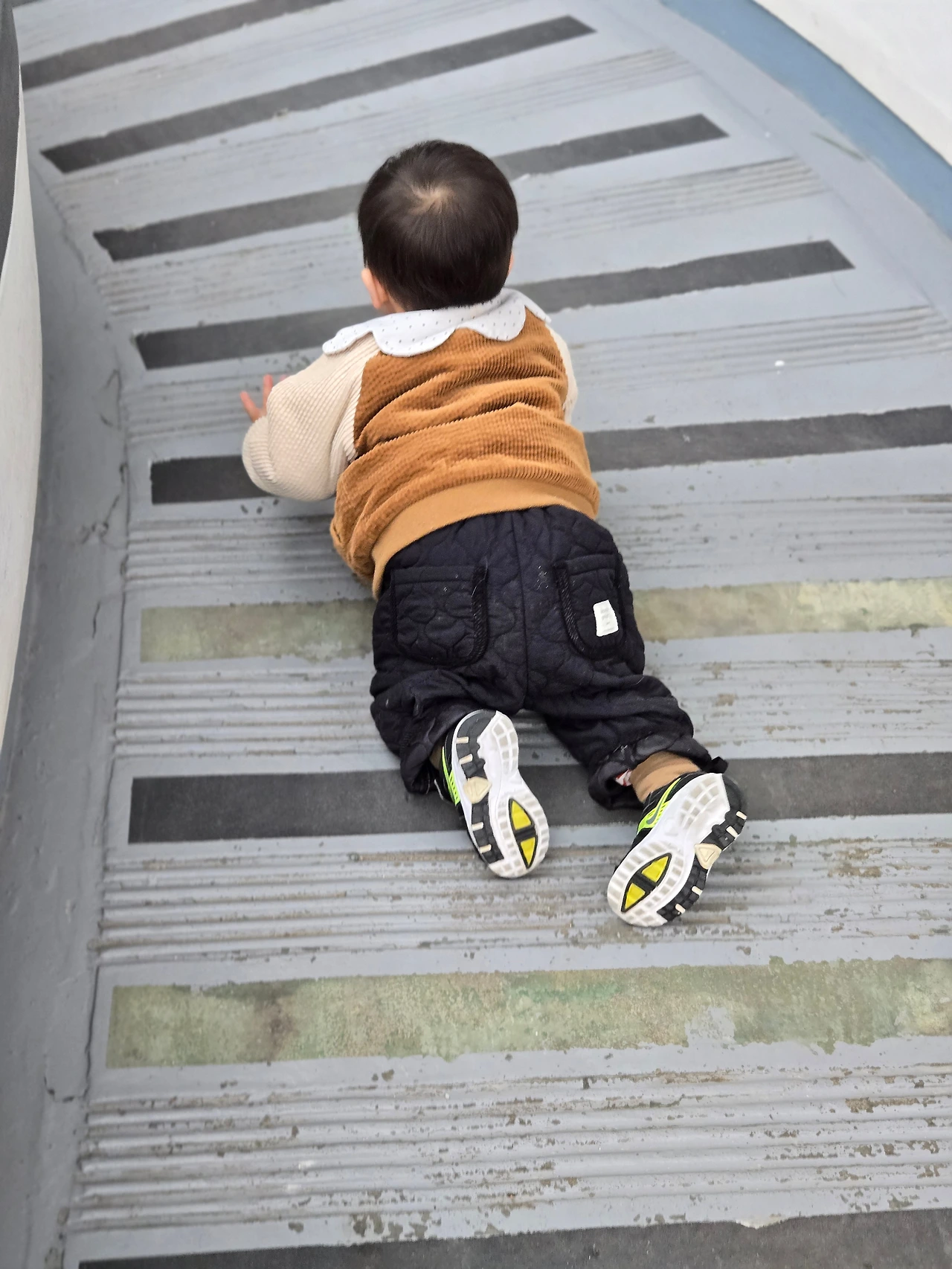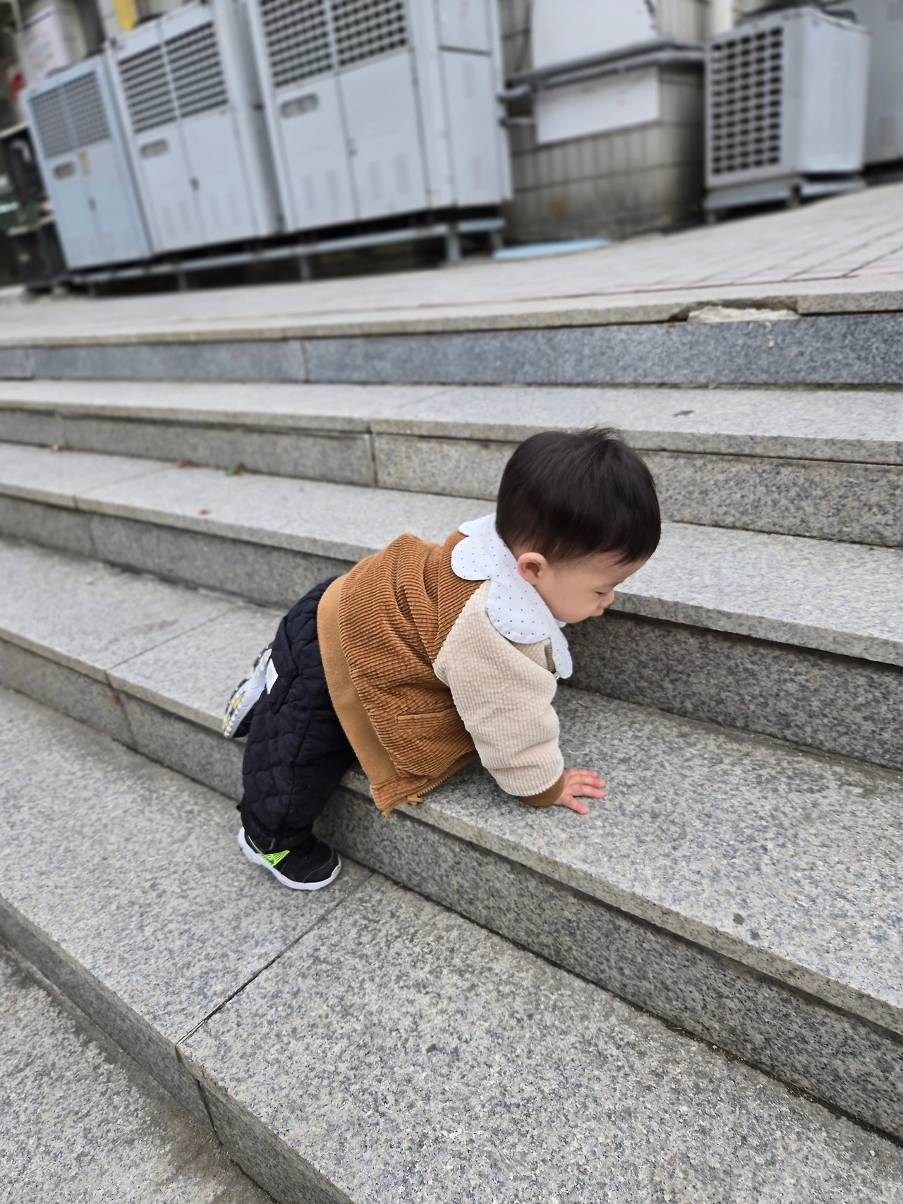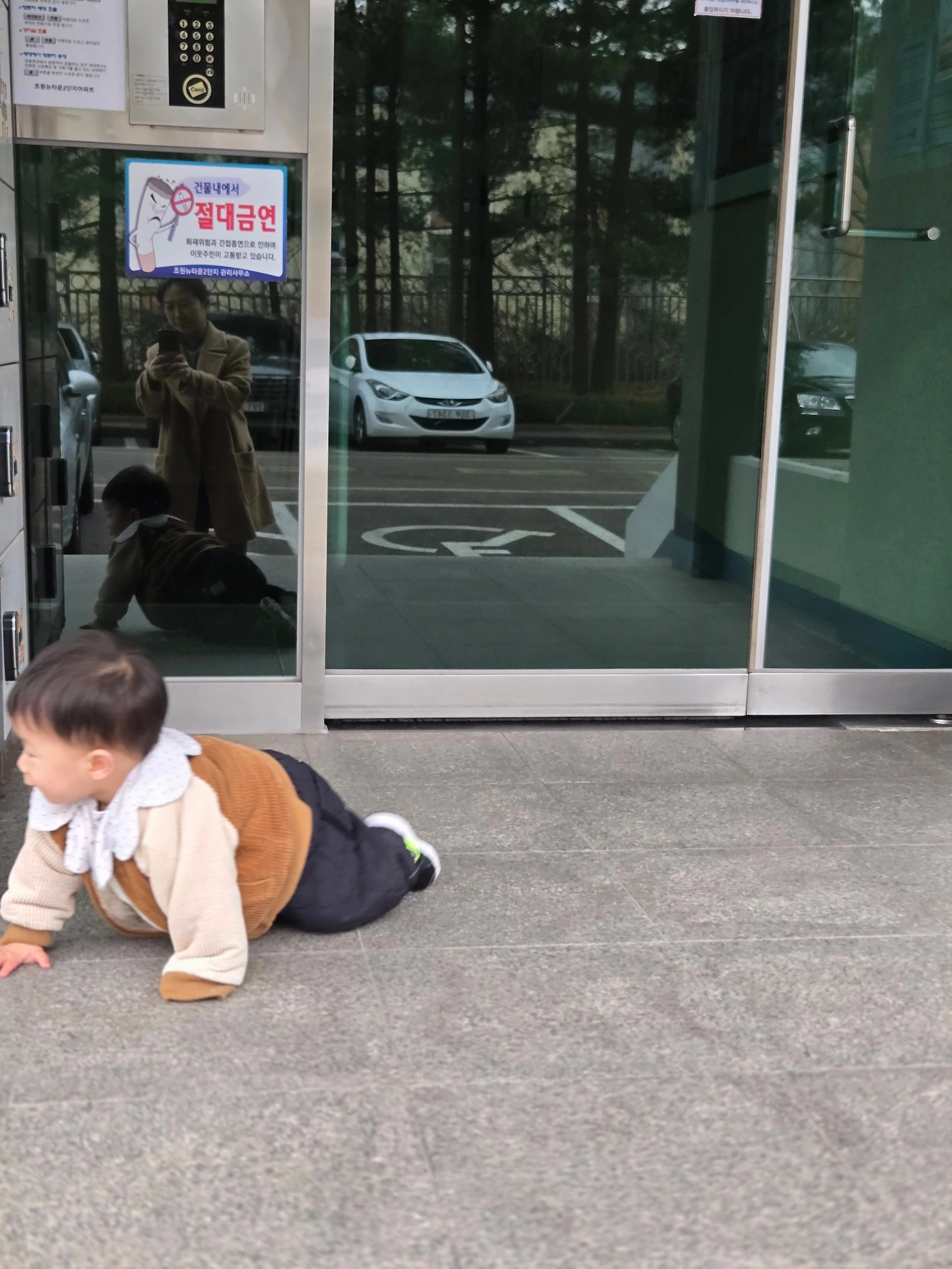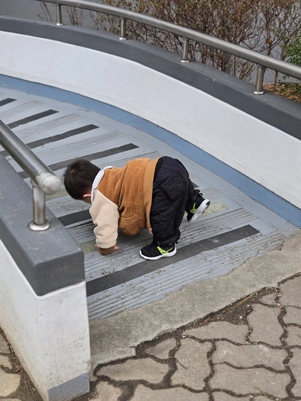 양갱이가 걷기 시작한 지 한 달 정도 지나니 제법 걸음걸이가 안정적이라 걸어서 밖을 돌아다니기 시작했다. 처음 이틀 동안은 기어서 현관을 나섰다. 현관의 3cm도 안 되는 작은 턱조차 큰 장애물이었나 보다. 매끈한 집바닥에서 걷다가 울퉁불퉁한 보도블록을 걷다 보면 곧잘 주저앉거나 넘어졌다. 다시 일어서기도 했지만 길바닥을 기어 다니기도 했다. 첫날은 대체로 지켜보기만 했는데 지나가는 사람들 보기 민망했다. 지금은 기어 다닐 것 같으면 손 잡고 걷는다.