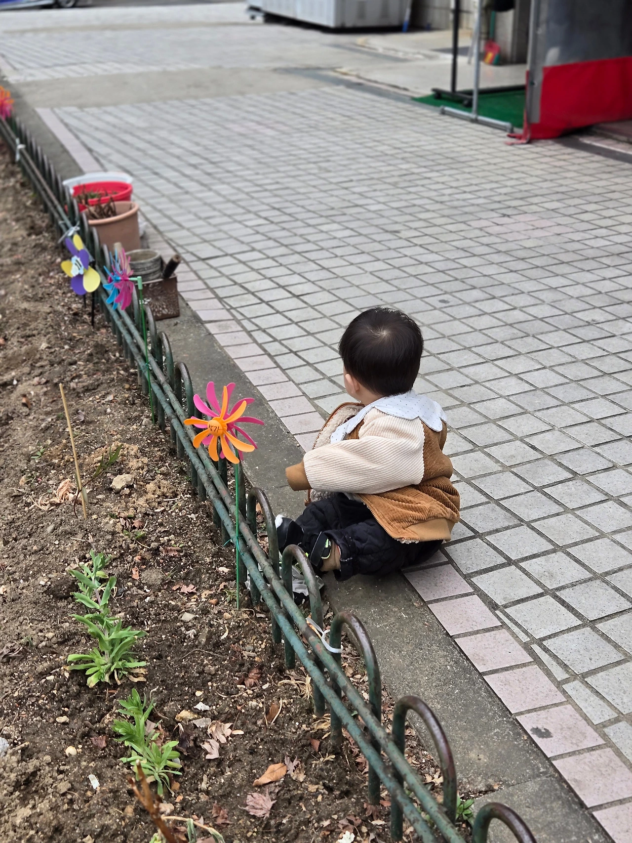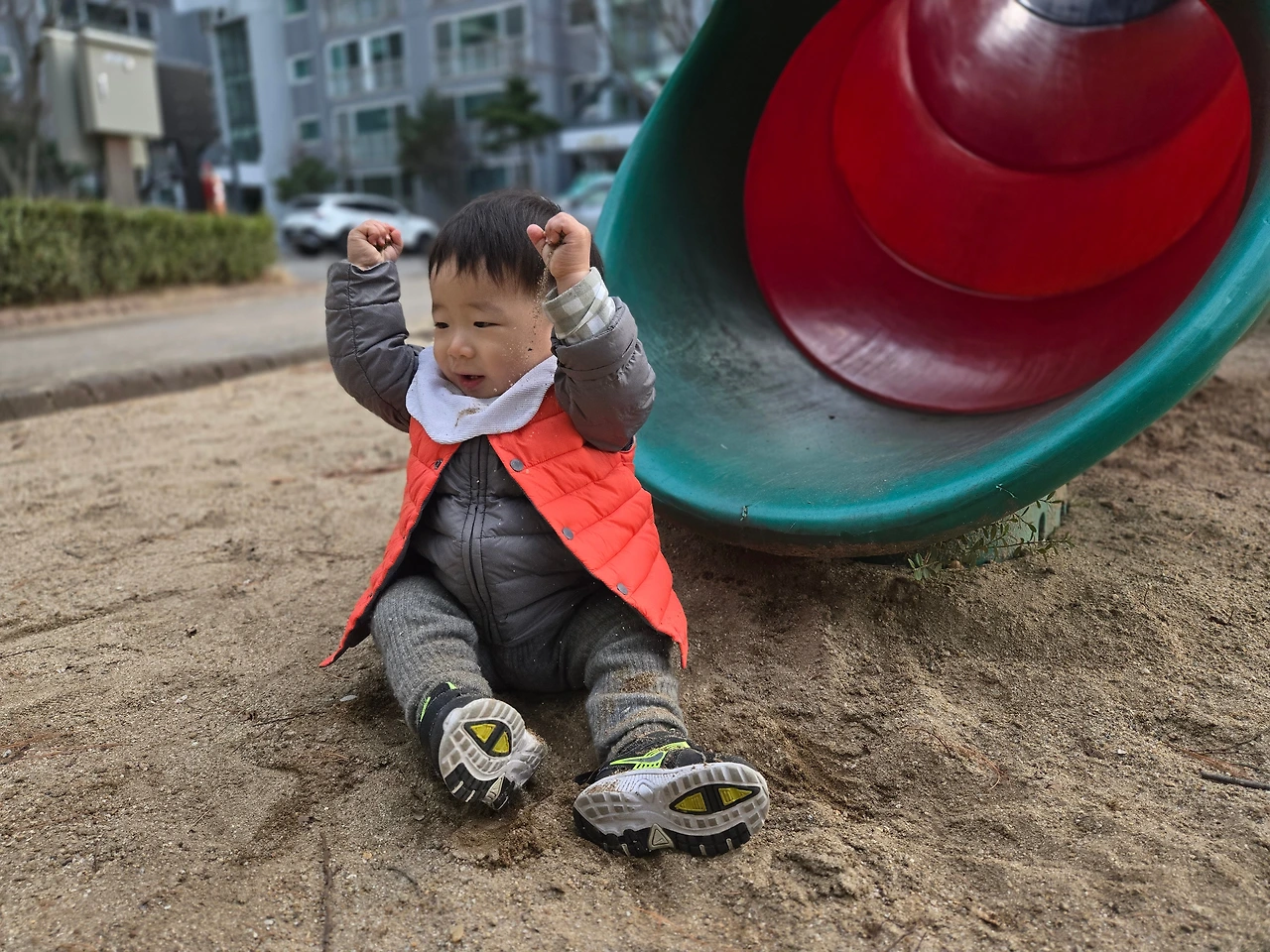 산책코스는 3분 거리에 있는 아파트 상가 떡볶이집에서 남편을 불러 어묵을 나눠 먹고 놀이터에서 놀다가 집으로 돌아가는 아주 간단한 코스다. 하지만 떡볶이집까지 가는 데 20분, 떡볶이집 앞 바람개비 가지고 노느라 20분, 집 앞 놀이터에서 모래놀이와 미끄럼틀로 20분이다. 한 시간은 휙하니 지나간다. 가는 길에 낙엽과 솔방울 던지며 놀고, 지나가는 모든 이들에게 인사하고 이쁨 받고 하다 보면 또 30분이 지난다. 어느새 날이 싸늘해져 결국 안고 들어올 수밖에 없다.