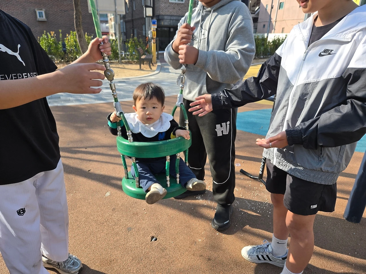 어제는 5, 6학년 형누나들 예닐곱 명한테 둘러싸여 있었다. '아기 너무 귀여워요~' , '우와 신발 진짜 작다', '몇 살이에요?' 라며 말 걸기도 하고, '야! 아기 앞에서 욕하지 마라!', '아기는 귀여운데 넌 못 생겼어!', '저는 몇 살로 보여요?'라며 시끄럽기 떠들기도 했다. 소리에 예민한 양갱이는 내게 떨어지려 하지 않기도 했지만, 혼자 돌아다니며 과격하게 노는 형누나들을 신기하게 관찰하기도 했다.