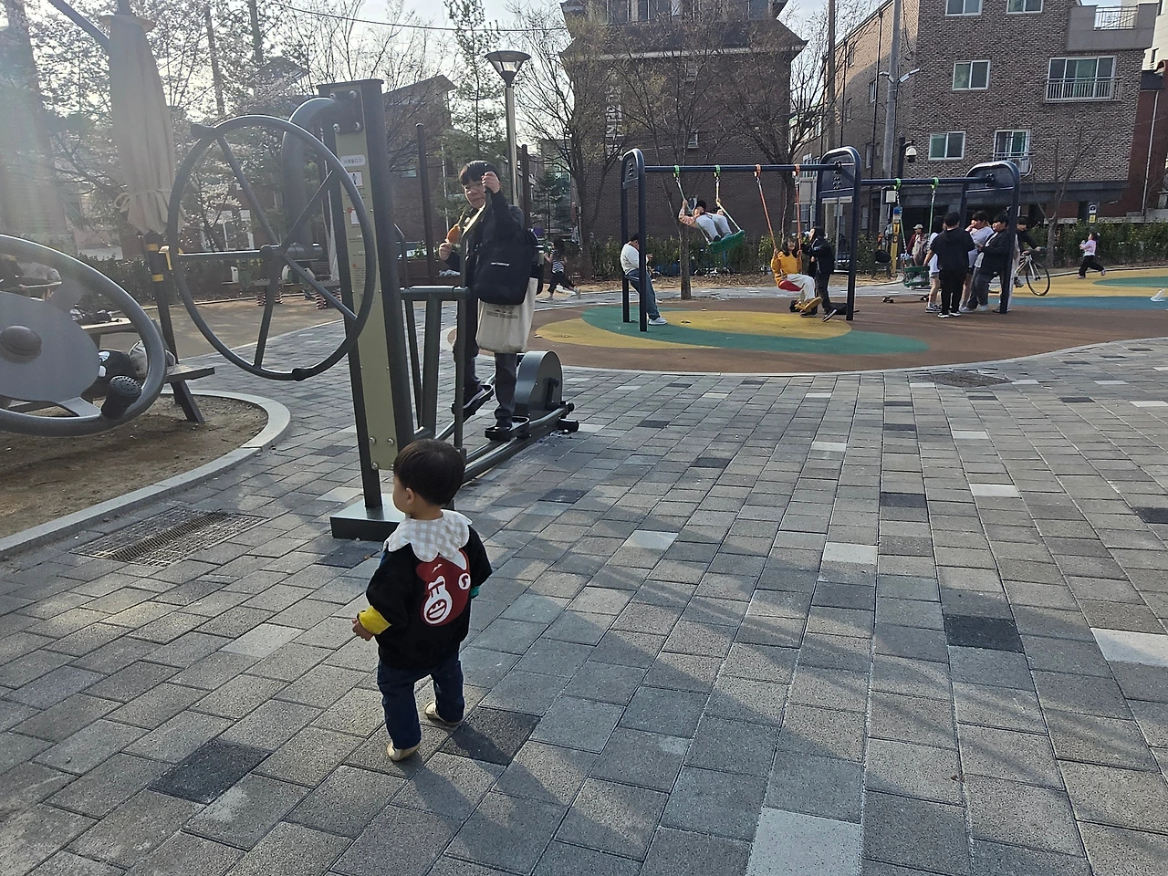 상가 앞 놀이터는 놀이기구는 다양하지 않지만 꽤 널찍하다. 종종 서너 명이 노는데 주로 초등학교 저학년 아이들이거나 보호자들을 대동한 영유아기 아이들이 있다. 그래서 하원하는 4시 이후에 아이들이 있다. 가끔 어린이집 엄마들을 마주치는데 만나면 반갑다. 반가움도 잠시 양갱이랑 미끄럼틀 타러 올라가야 한다.
