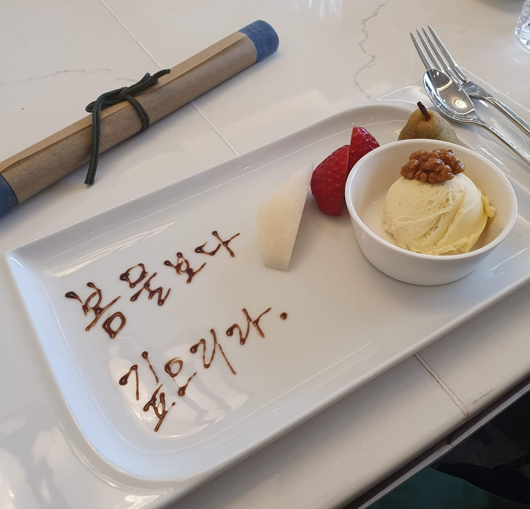 마지막 디저트의 레터링 서비스도 있었다. 7글자 정도 작성 가능하다고 해서 한용운의 사랑을 그릇마다 다른 구절로 요청했다.
