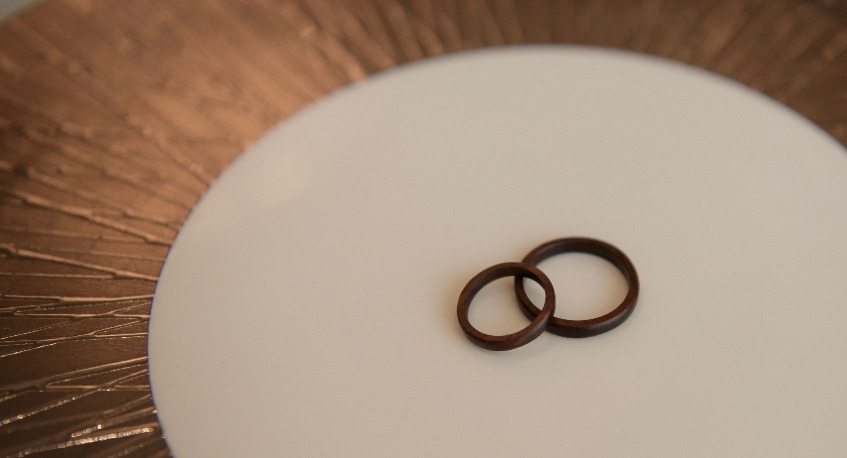 나무로 만들었다. 아이디어스에 의뢰해서 제작했다. 비싼 브랜드 반지보다 결혼 반지의 원래 목적인 신랑 신부의 결합을 의미하는 수준에서 준비했다.