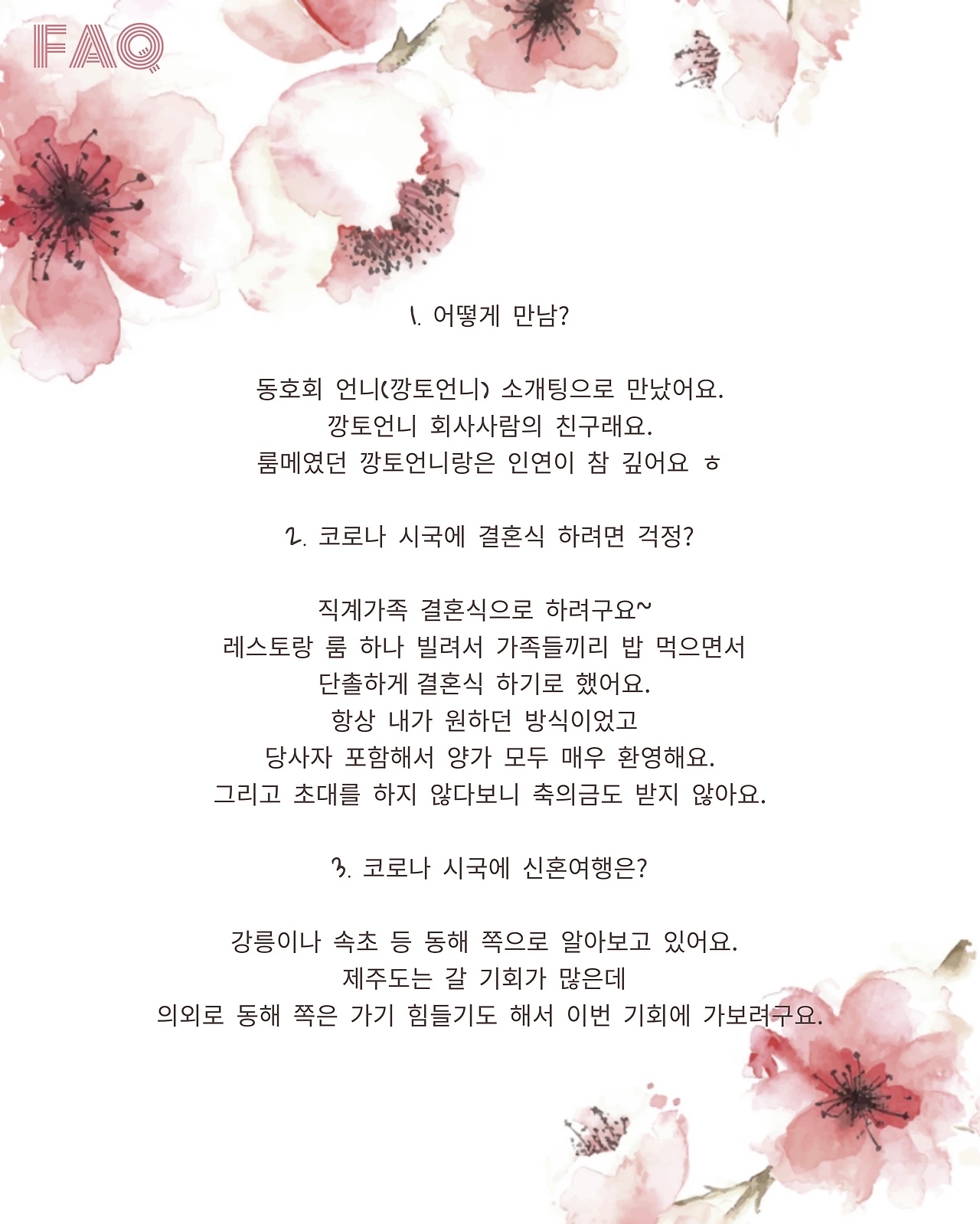 초대하진 않지만 결혼한다고 알리긴 해야 해서 알림장을 만들기로 했다. 일반 청첩장의 우아하고 정중한 멘트보단 실리적으로 만들고 싶었다. 그래서 주변 사람들이 주로 묻는 질문을 10개로 추려 Q&A 카드를 만들었다. 신혼집은 어딘지, 남자는 어떻게 만났는지, 고양이는 어떻게 할 건지 등. 모바일 이미지 편집앱으로 금방 후다닥 만들었다. Q&A 카드를 받으면 대부분은 더 이상 궁금한 게 없다. 일일이 똑같은 얘기를 반복하지 않아도 돼서 편했다.