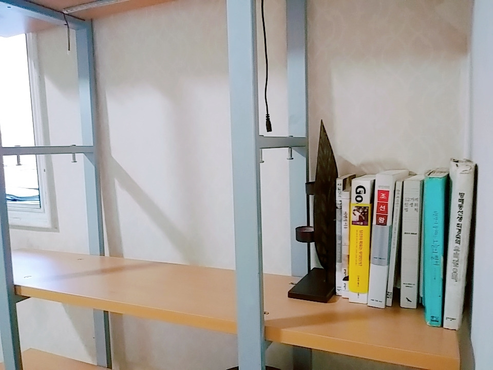 나무와 철제로 만들어진 북유럽식 모던함이 묻어나는 5단 책장. 5단 책장에 빽빽이 책을 채우면 참 멋지겠다는 생각을 했고 중간중간 원서 제목이 드러나는 책이 보이면 금상첨화.
