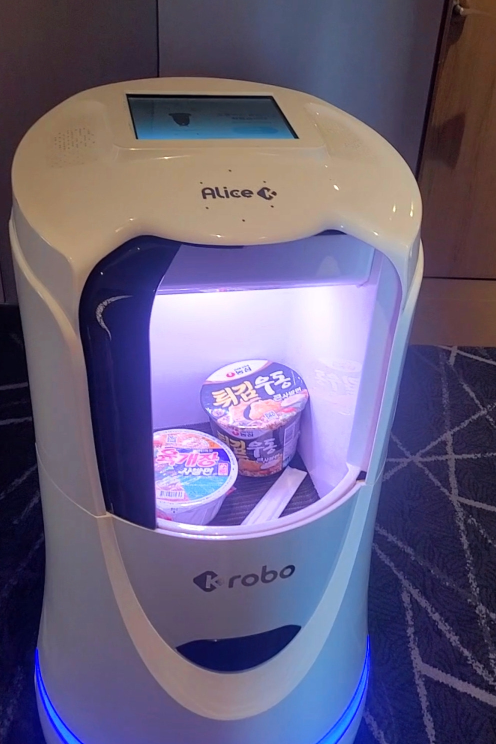 그러던 어느 날 남편과 호캉스를 갔다. 밤늦게 배가 고팠다. 너무 늦은 시간이라 룸서비스는 마감이었고, 잘 준비한 상태라 밖에 나가기 귀찮았다. 마침 24시간 로봇 배달 서비스를 운영하고 있었다. 그런데 메뉴에 먹을 거라곤 컵라면