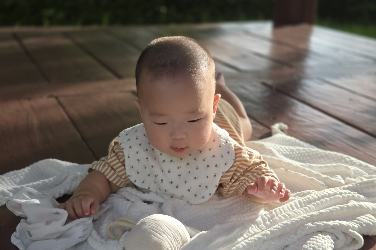 정자 위에 하얀 속싸개를 펼쳐놓고 양갱이를 뉘었다. 터미타임도 하고 뒤집기도 연습시키곤 했다. 요즘엔 네발 기기 연습하고 있다.