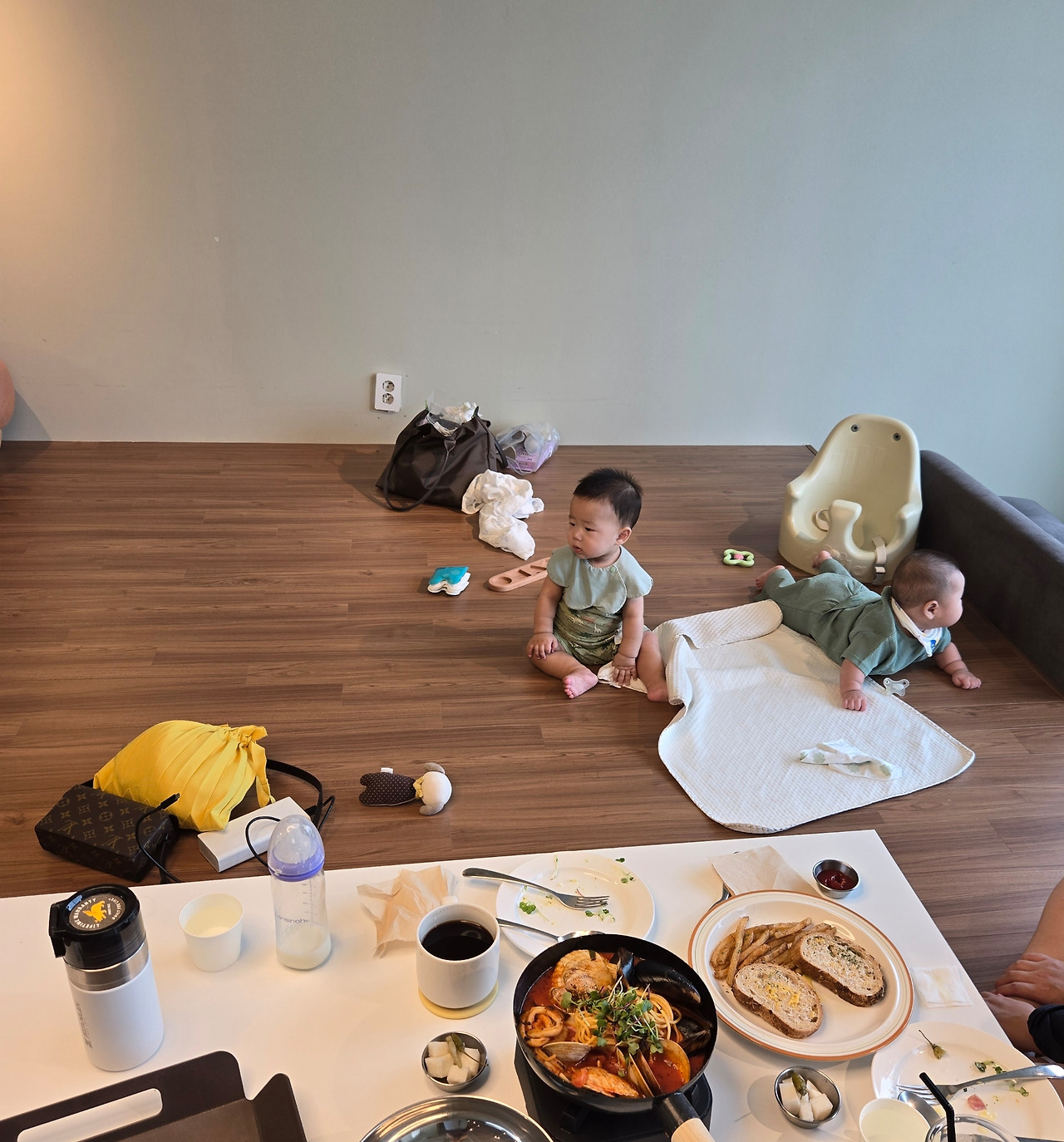 특히 나는 남편의 늦은 퇴근으로 항상 혼자 저녁을 보내기 때문에 덕이와 술 한 잔과 함께 한 육아수다가 더 즐거웠다. 룸 안에 있는 대형 목욕탕에서 아기 수영 하면서도 덕분에 따뜻한 물에 몸을 담그니 근육통이 잦아드는 듯하다. 퇴실한 뒤엔 덕이가 찾아놓은 브런치 가게에 가서 점심을 해결하고 헤어졌다. 우리 둘은 아빠 없이도 가뿐하다며, 자주 이런 시간 가지자며 서로 뿌듯해했다.